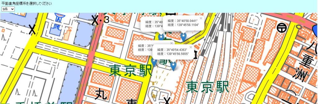 地図をダブルクリックすることで、座標を調べるピンが立ちます。施工箇所を地図で探し、施工範囲の四隅にピンを立てます。